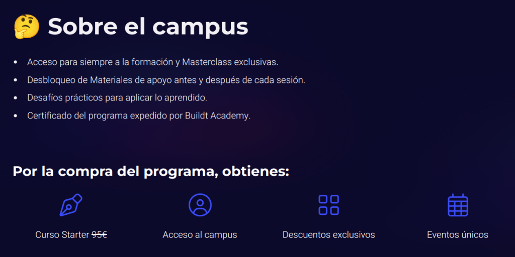 👉 A continuación, voy a intentar que conozcas a fondo el programa de BUILDT ACADEMY desde mi experiencia para que todo te resulte más fácil de entender y sobre todo que te sirva para ver si esta formación es para ti o no.