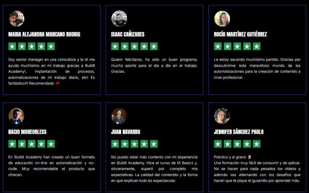 En cambio, Buildt Academy te permite empezar por solo 45 € con el curso Automation Starter y luego escalar al programa completo si lo deseas.